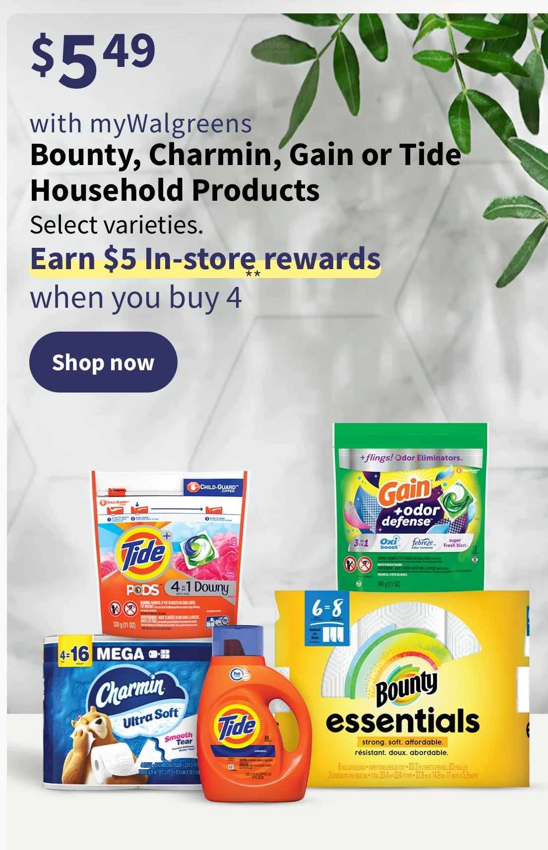 $1.50/1 Tide, $1/1 Bounty, $1/1 Charmin, $5 Register Reward & Tell the cashier you would like to use $5 Walgreens Cash. Enter your zip code.
